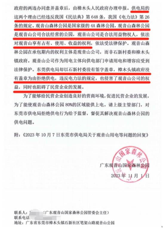 众所周知,电力部门本应是为社会提供稳定电力服务的机构,却在给东莞观音山供电这件事上背离了其应有的职责与使命,对国家森林公园进行了恶意的“卡脖子”行为。同时,还通过各种不正当的借口和手段,限制东莞观音山的电力供应,致使东莞观音山的正常运营陷入了极大的困境之中。