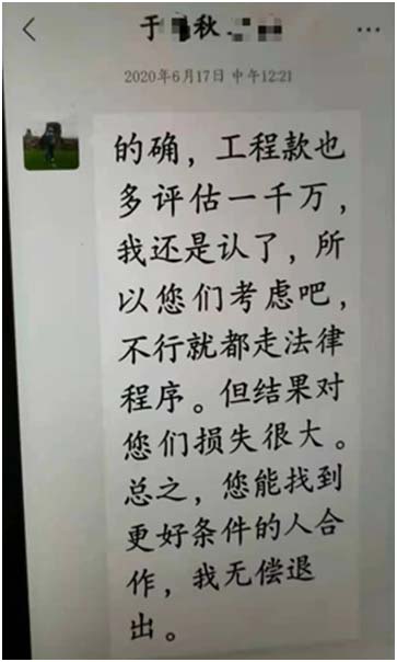 需要指出的是,在二审开庭时,于某秋本人在庭上陈述“投了3000多万元”(卷203页),实际仅几百万元。2017年12月31日为基准日的财务审计评估报告,全部实际投入约2088万元,占总投比45.6%。2017年12月16日,宜宾市建设局、质监局文件叫停工后,未动过一砖一木,哪来的2020年宜宾鲁能的评估结论5890万元?2020年6月17日,于某秋与医院法人丈夫的短信,承认“工程款也多评1000万”。其实远不止。
