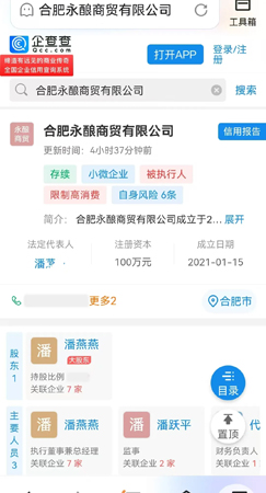 网上查询“合肥永酿商贸有限公司”显示,续存、小微企业、被执行人、限制高消费、自身风险6条。法定代表人为潘燕燕,公司成立于2021年1月15日。