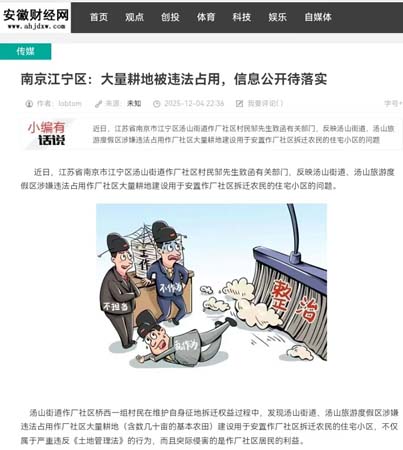 近日,江苏省南京市江宁区汤山街道作厂社区村民邹先生致函有关部门,反映汤山街道、汤山旅游度假区涉嫌违法占用作厂社区大量耕地建设用于安置作厂社区拆迁农民的住宅小区的问...