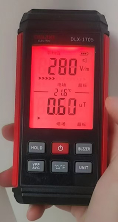 电磁辐射超标:卧室关闭状态的音响周边,电场强度达350—360V/m,远超《电磁辐射防护规定》(GB8702—2014)中公众暴露控制限值(电场强度 40V/m),超标近9倍。图为近日检测的卧室的电磁辐射强度,超过正常值的百倍之多,测试表已经呈红色最高警示。磁场强度同步异常,形成“定向辐射”特征。