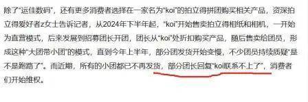 ……而近期,所有的小团都已不再发货,部分团长回复“koi联系不上了”,消费者们开始维权。(见下图上观新闻图一图二)