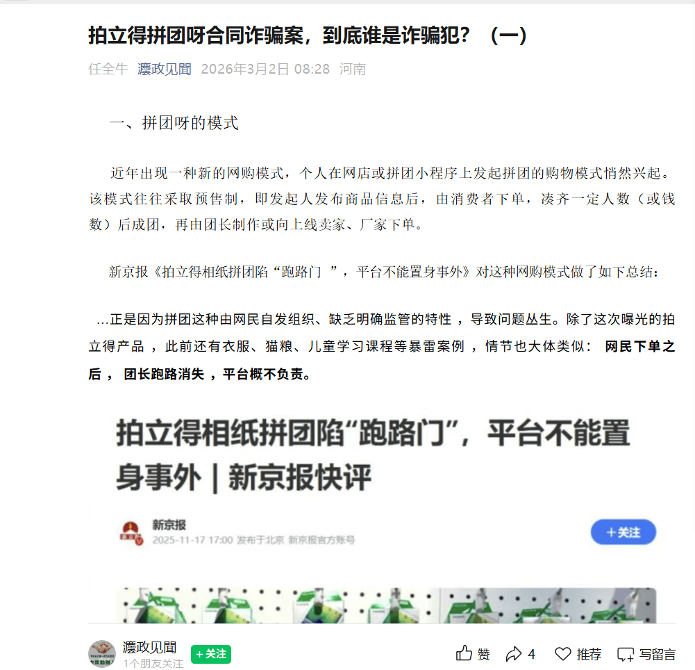 《新京报》在2025年11月17日发布快评;《拍立得相纸拼团陷“跑路门”,平台不能置身事外》对这种网购模式做了如下总结: