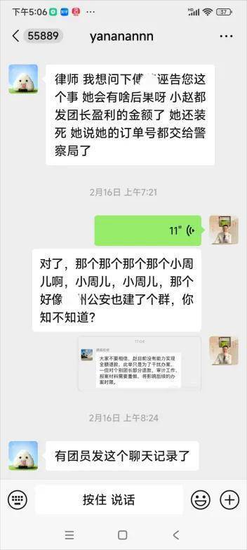 由于张海律师写了《关于KOI经营状况的律师意见函》,有团员周某加了张海律师微信,后来周某把鹅团团长傅某拉入群,三方进行了对话。由于前期张律师提供的三方协议需要傅某提供订单号,傅某一直拒不提供,还对律师进行诽谤,做了一些不利影响,周某在群里表示:律师,他不愿意(配合提供订单号)那么你和小赵商量好把这单退了,证明给团长们看,团长就和团员配合了。