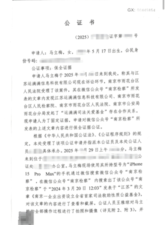 经查证,2024年3月20日,雨花台区公检法与运满满公司共同签署《“运满满司法关爱基金”设立协议》,由运满满公司出资20万元,涉事司法机关派员组成基金审批小组,其中包含雨花台区法院刑事审判庭成员,该基金的救助对象明确为运满满平台的受害司机。上述合作信息曾通过“南京检察”微信公众号对外发布,后因马立梅举报被删除,马立梅已对该公众号文章进行保全证据公证,公证书(2025宁银国信证字第3773号)成为关键证据。