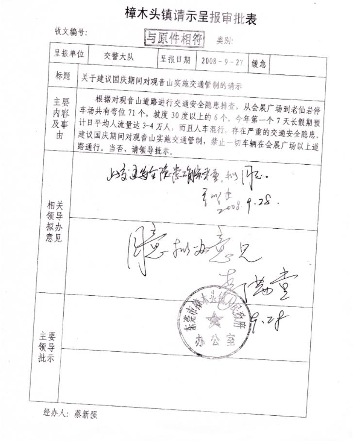 就在开幕式当天,下午5点来钟,樟木头党政办给观音山公园来电,要求派人去取一份文件。等黄淦波看到文件的时候已经是下午6点了。这是一份由樟木头镇李书记批复同意执行的函件,批复的是樟木头交警大队给镇委镇政府的报告,主要内容是:为了安全原因,从国庆黄金周开始,禁止一切车辆上下观音山。