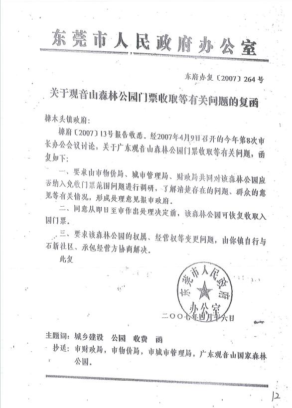 2007年12月26日,观音山公园向樟木头镇人民政府提出书面申请,希望镇政府能够发函取消收购观音山,镇政府没有回复。