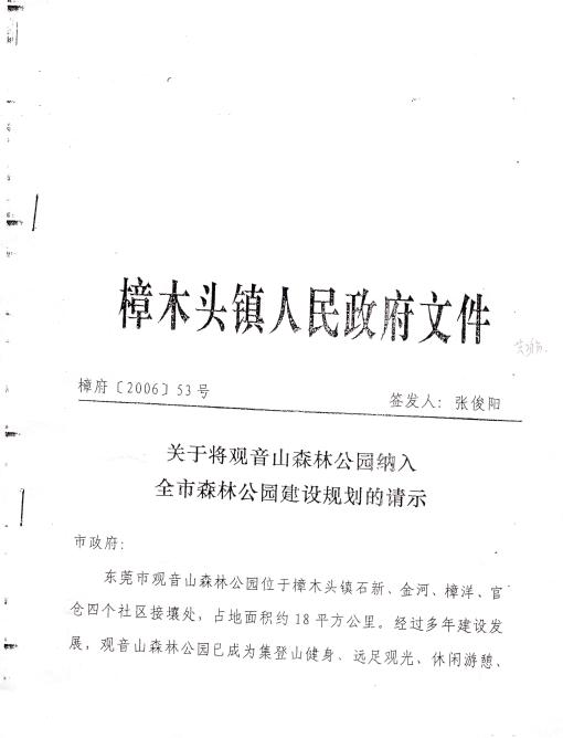 2006年10月10日,樟木头镇政府向东莞市政府提交樟府(2006)53号《关于将观音山森林公园纳入全市森林公园建设规划的请示》,提出:东莞市观音山森林公园位于樟木头镇,由石新、金河、樟洋、官仓四个社区接壤处,占地面积约18平方公里。经樟木头镇委、镇政府研究,决定收回观音山森林公园的经营权,由镇政府担任投资主体和经营主体。按照总体规划投资概算,预计共需投入资金5亿多元。鉴于樟木头镇财力有限,请市政府同意将观音山森林公园纳入全市的森林公园建设规划中,由市投入主要资金进行建设。