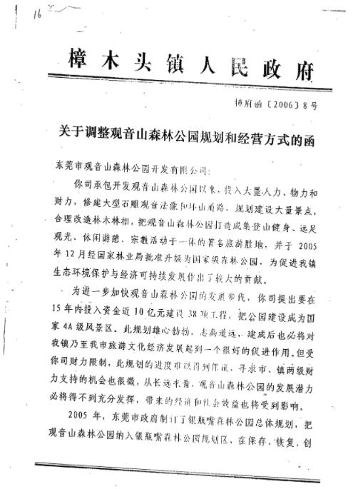 2006年6月9日,樟木头镇政府向观音山公司发出樟府函(2006)8号《关于调整观音山森林公园规划和经营方式的函》提出:你公司承包开发观音山森林公园以来,投入大量人力、物力、财力,把观音山森林公园打造成著名旅游胜地,并于2005年12月经国家林业局批准升级为国家级森林公园,为我镇作出了较大的贡献。
