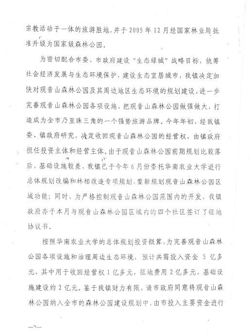 这工作计划的弦外之音就是,收购还是要继续的,拿下观音山也是迟早的事,黄淦波你就走着瞧吧。2008年7月6日,观音山公园再次提出书面申请,樟木头镇政府还是采取拒不回答的态度。