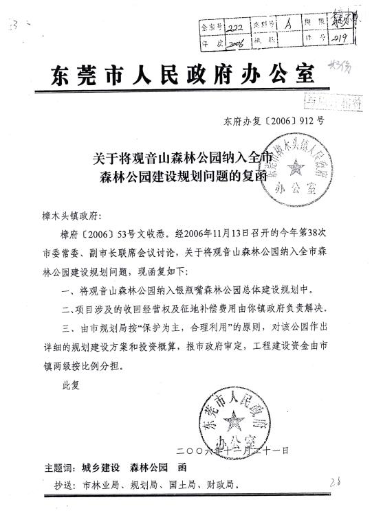 2006年11月21日,东莞市政府办公室就樟木头镇政府的来文作出东府办复(2006)912号《关于将观音山森林公园纳入全市森林公园建设规划问题的复函》,函复内容:一、将观音山森林公园纳入银瓶嘴森林公园总体建设规划中。二、项目涉及的收回经营权及征地补偿费用由你镇政府负责解决。三、由市规划局按“保护为主、合理利用”的原则,对公园作出详细的规划建设方案和投资概算,报市政府审定,工程建设资金由市镇两级按比例分担。