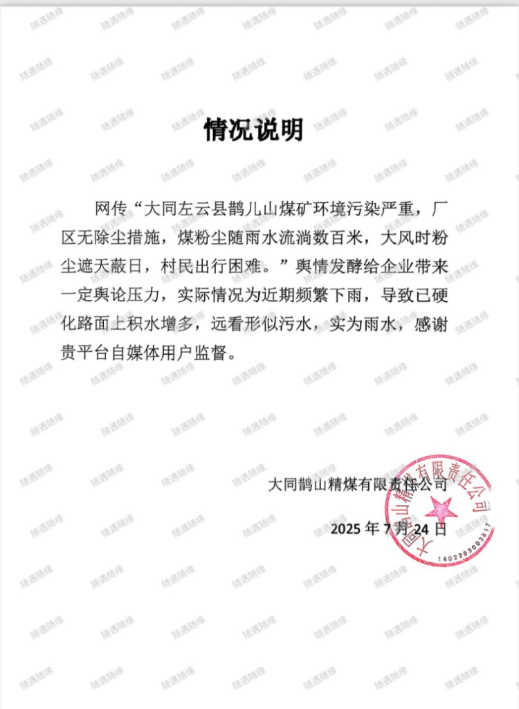 近日,大同鹊儿山精煤有限责任公司因环境污染问题被媒体曝光后,非但没有积极整改,反而试图通过删稿掩盖问题。 这一行为不仅暴露了企业漠视生态环境与公共健康的姿态,更折射...