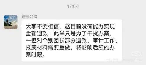 据知情人士透露,说出这句话的人是办理此案的山东某分局经侦大队的干警商某。“大家不要相信,赵目前没有能力实现全额退款,此举只是为了干扰办案,一但对个别团长部分退款,审计工作、报案材料需要重做,将影响后续的办案时限”从此话可以看出来,商警官对工作非常的敬业,都顾不上法律规定严禁制造冤假错案,严禁制造伪证。怂恿动员团长们不配合退款,其用意就是想让赵女士把这个合同诈骗犯罪嫌疑人的角色彻底扮演下去。
